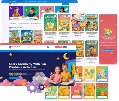 Launch a child-focused digital store with prebuilt layouts and ready-to-sell products.